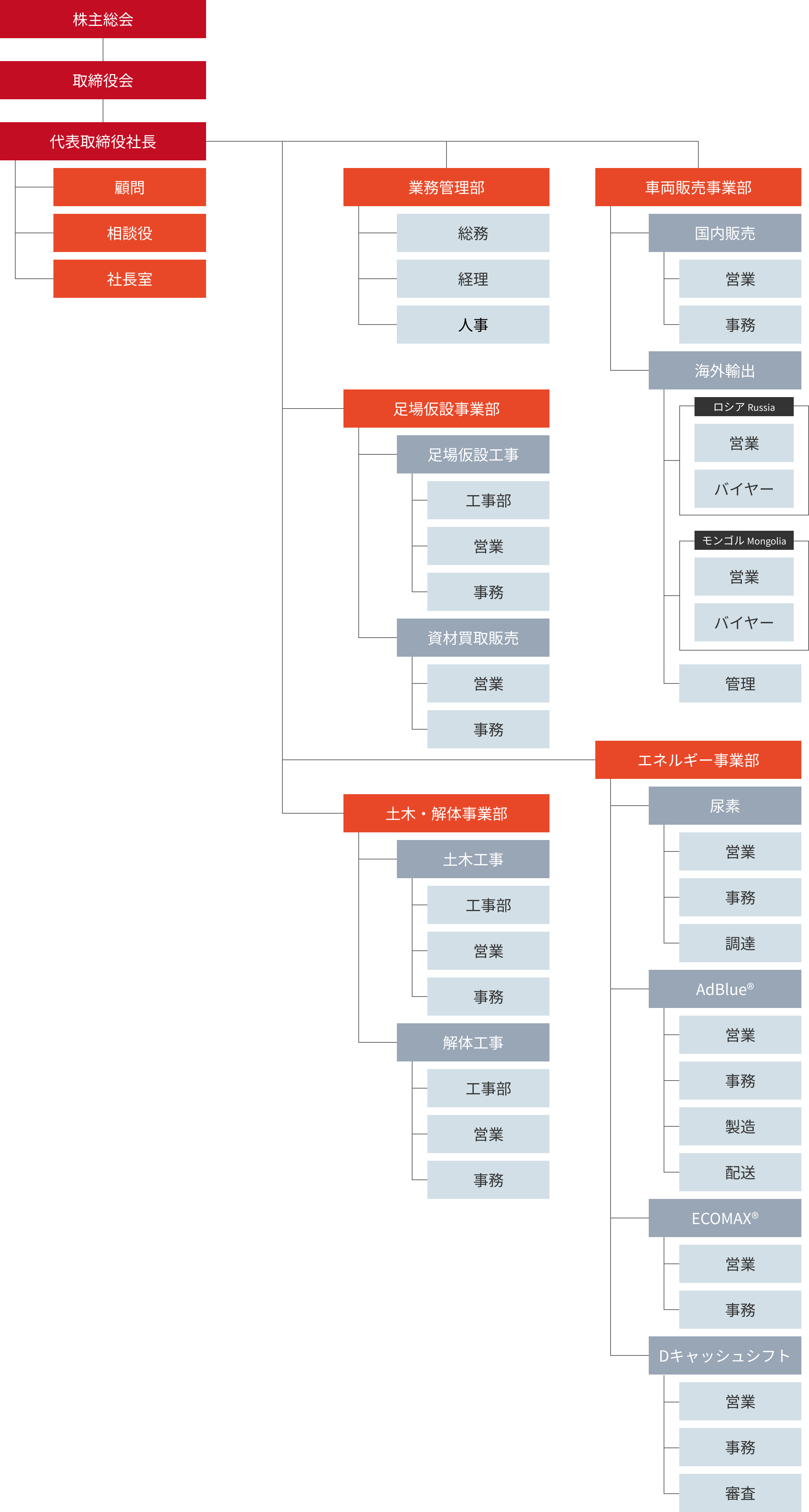 ・足場仮設(工事・資材買取販売) ・土木解体(建築・運搬・復興支援事業) ・車両販売(国内販売・海外輸出) ・エネルギー(尿素・AdBlue®・ECOMAX®・Dキャッシュシフト) ・不動産 |