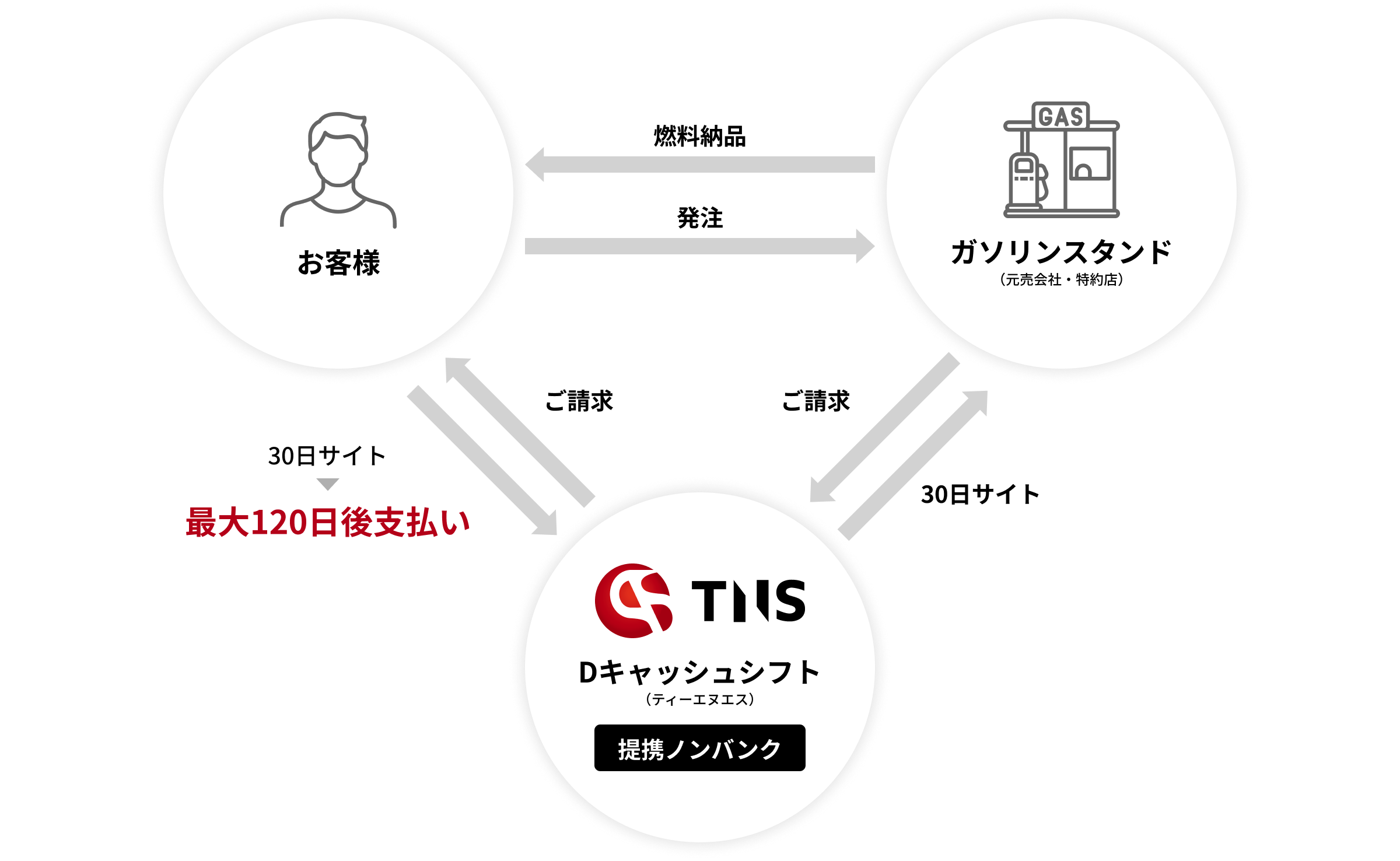 仕入れた軽油の代金を、最大120日後にまとめて支払うことで、月末の資金圧迫をなくし、事業の“動き出し”を止めない仕組みです。