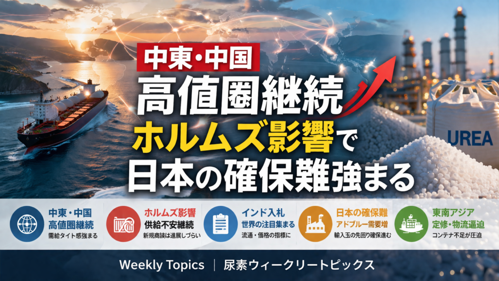 ホルムズ海峡の開放が見通せないなか、FOBバルト海・中東・中国はそろって大幅高となった。中国は輸出規制継続観測で輸出玉が乏しく、日本ではアドブルー向け原料の先回り確保が進む一方、供給不足感はなお残る。インドの新規入札、東南アジアの定修入りと物流逼迫が、次の市況判断材料として意識される。