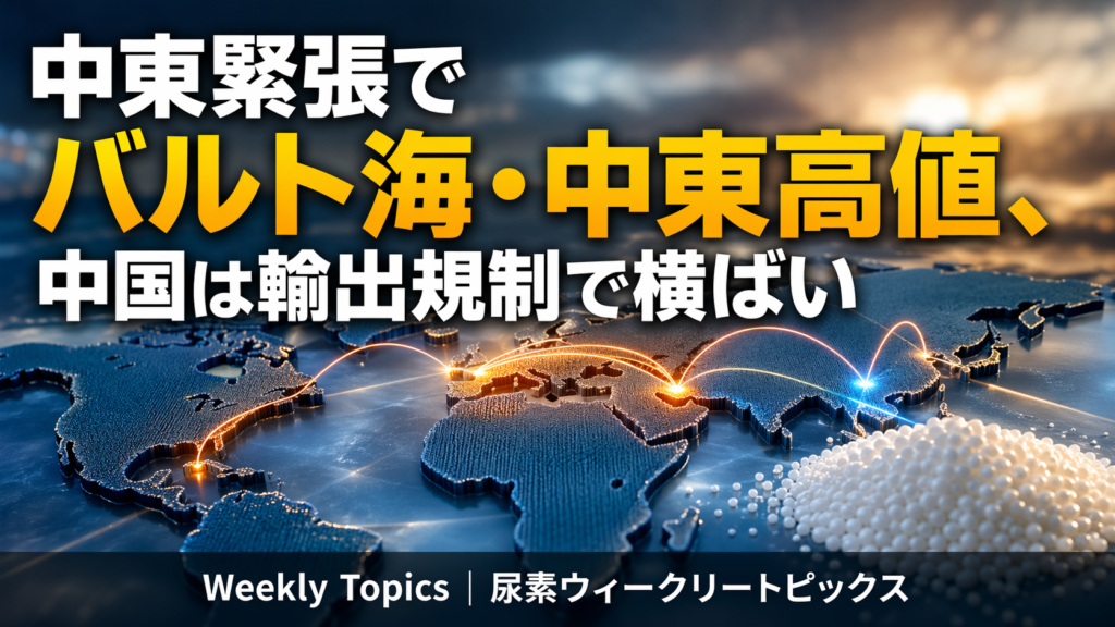 中東情勢の緊張が続き、FOBバルト海と中東は前週比で切り上がった。一方、中国は輸出規制の長期化懸念からスポット商談が進まず横ばい。日本はCIFこそ据え置きだが、輸入減少と物流コスト上昇を背景に国内需給の引き締まりが意識されている。欧州のガス高も原料コスト面の支えとなり、インドは次回入札待ちで様子見色が強い。