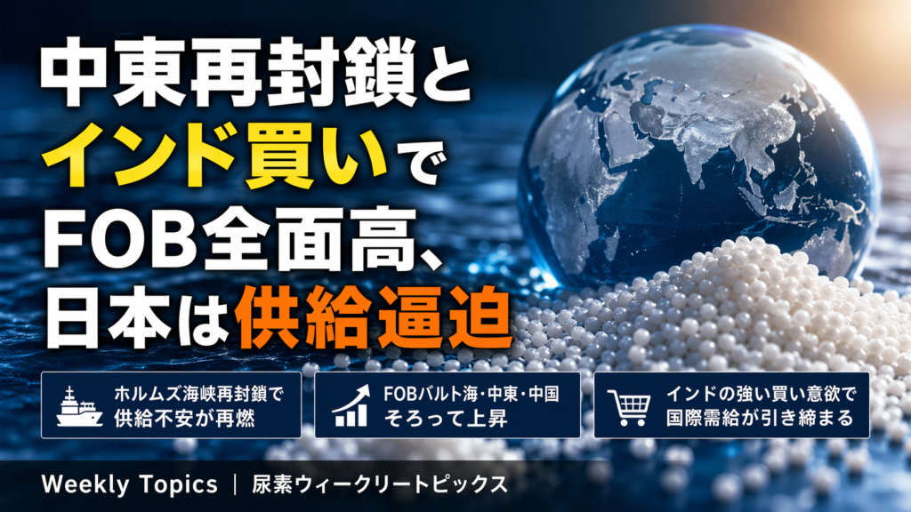 ホルムズ海峡の再封鎖で中東の供給不安が再燃し、インドの強い買い意欲も重なってFOBバルト海・中東・中国はそろって切り上がった。中国は輸出規制継続観測で内需優先が意識され、日本ではアジア域内の玉不足に加え、国内メーカーの出荷調整やコンテナ不足も重なり、輸入・国産ともに手当てしにくい状態が強まっている。