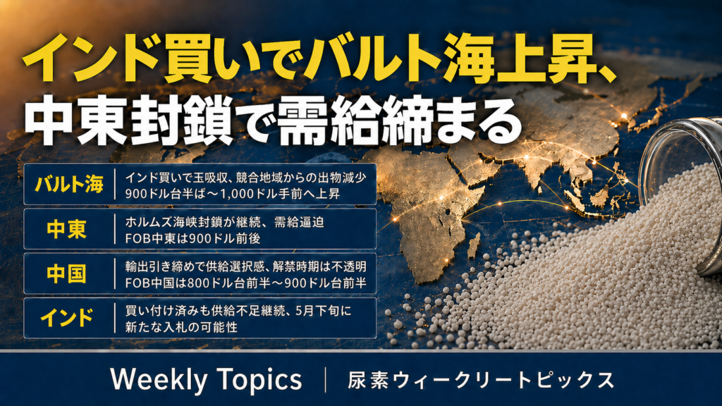 国際尿素市況は、インドの買い付けを起点にFOBバルト海・中東・中国が上昇した。バルト海では欧州競合地域からの玉が吸収され、中東はホルムズ海峡封鎖の継続で供給警戒が残る。中国は国内供給に選択感があり、輸出解禁の見通しはなお不透明だ。